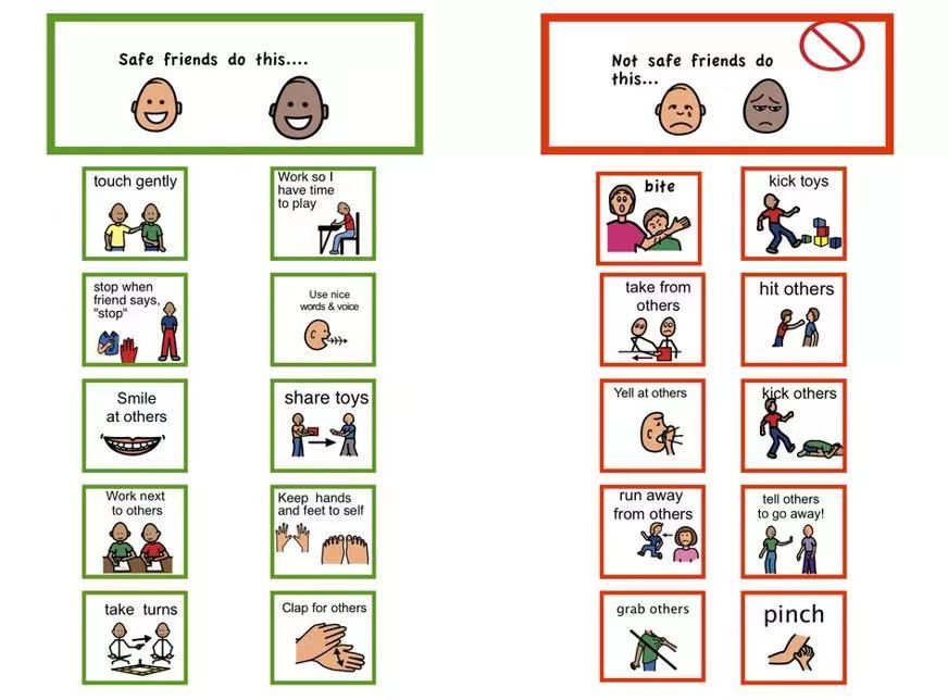 制作行为规范的社交故事。下图左边是“朋友之间这样做”——他们轻轻地触碰,他们对彼此微笑,他们会彼此鼓掌,他们会分享玩具。右边是“这样我们不能成为朋友”——他们拿走对方的东西,他们彼此大喊大叫,他们让对方走开。