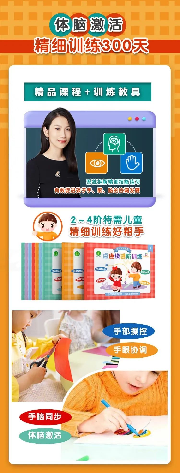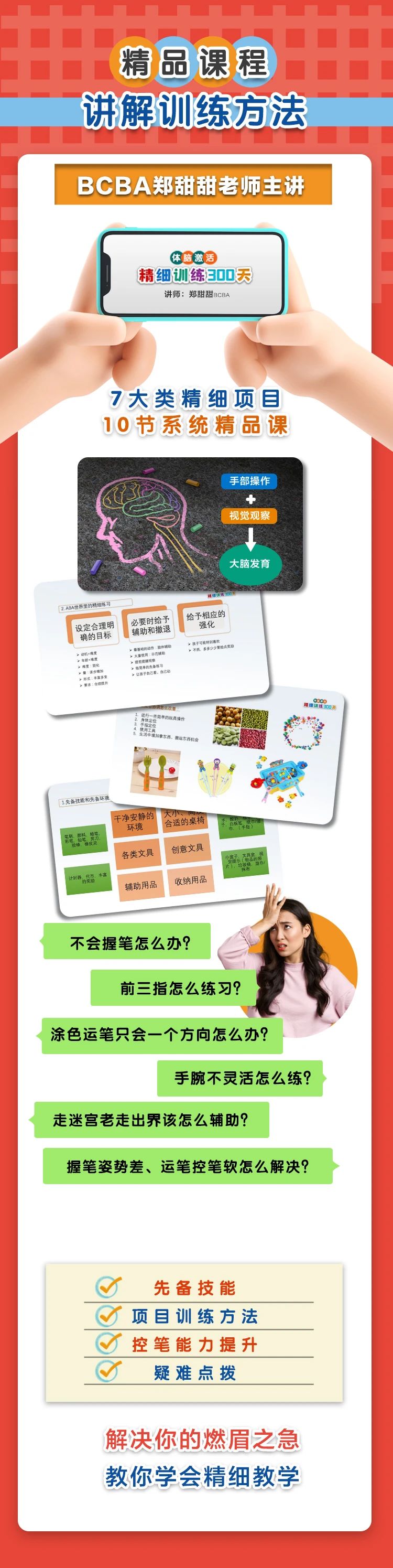 为了让2~4阶的孤独症、感知觉异常、发育迟缓、手部精细落后的儿童获得更好的相关干预训练,ALSOLIFE的教研团队研发了一套精品课程加教具组合产品——体脑激活:精细训练300天,帮助每个孩子提高手部操控能力、激活大脑发育、完善手眼脑的协调发展。