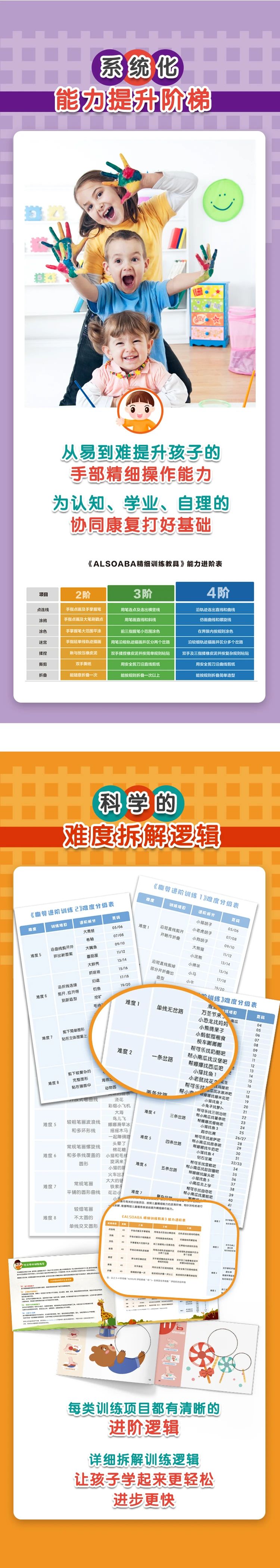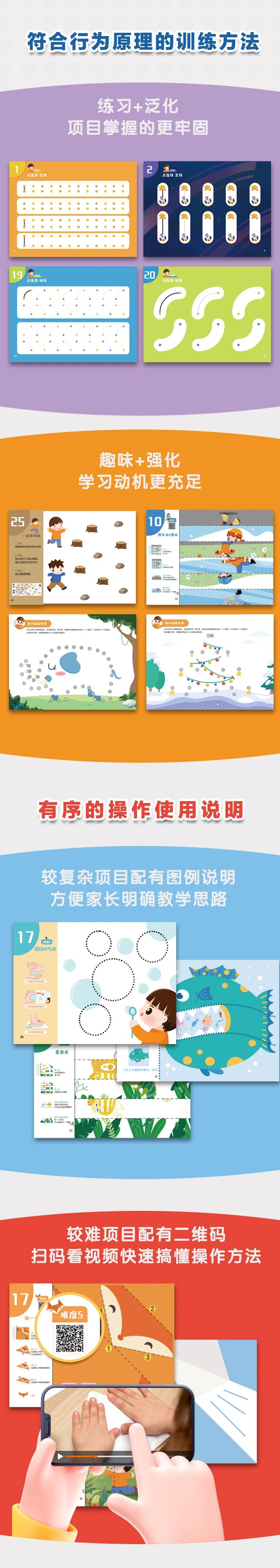 这套精细训练课程+教具书的组合拳,区别于其他普通儿童精细训练书的蕞显著的特点,在于整个课程和教具体系中,大量运用了ABA的难度拆解、训练与泛化、辅助与强化的原则来设计,更加贴合特殊需要儿童的需求,能够帮助孩子循序渐进地提升手部精细能力,促进体脑激活。