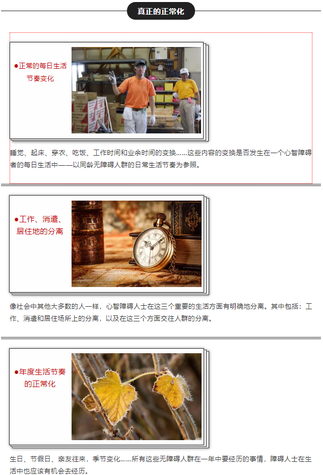 本着这一目标而提供的社会辅助应该尽可能的正常和少量,但要尽可能的专业和全面。”