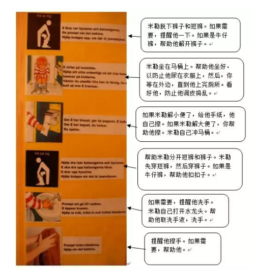 这是一个为初学习如厕的孩子做的一个较为详细的如厕流程图。图右边的说明主要是给与孩子工作的成年人准备的帮助指南,目的是所有和孩子工作的老师尽可能采取相同的工作方式。