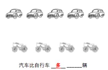 5. 当孩子得出结果“1个”,家长要求孩子把答案“1”写在题目的横线上,并且要求孩子使用完整口语回答一次“汽车比自行车多1个”。